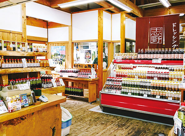 30年以上の歴史があるぽん酢とドレッシングの専門店。店内には、看板商品のゆずのぽん酢のほか、ピリ辛のごまだれや、大原の名産赤しそを使ったノンオイルの赤しそドレッシングなど、数十種類が並ぶ。